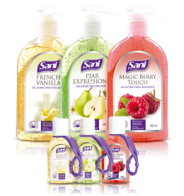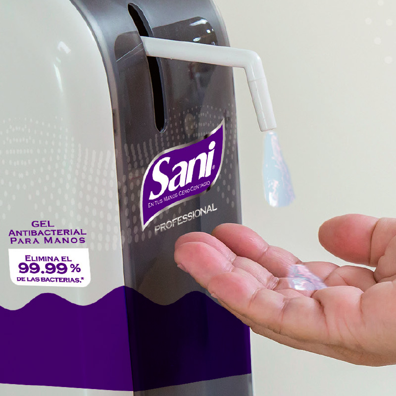 - Aplique Sani en sus manos una cantidad suficiente para cubrir palmas y dorsos, frote hasta que seque.